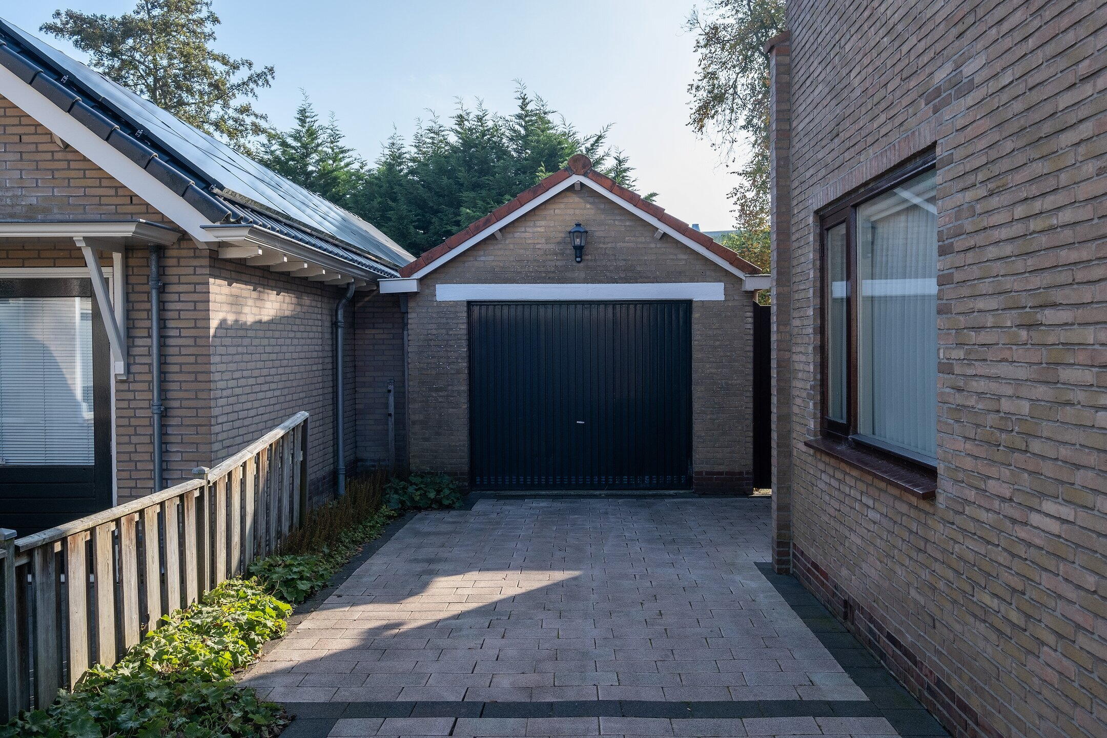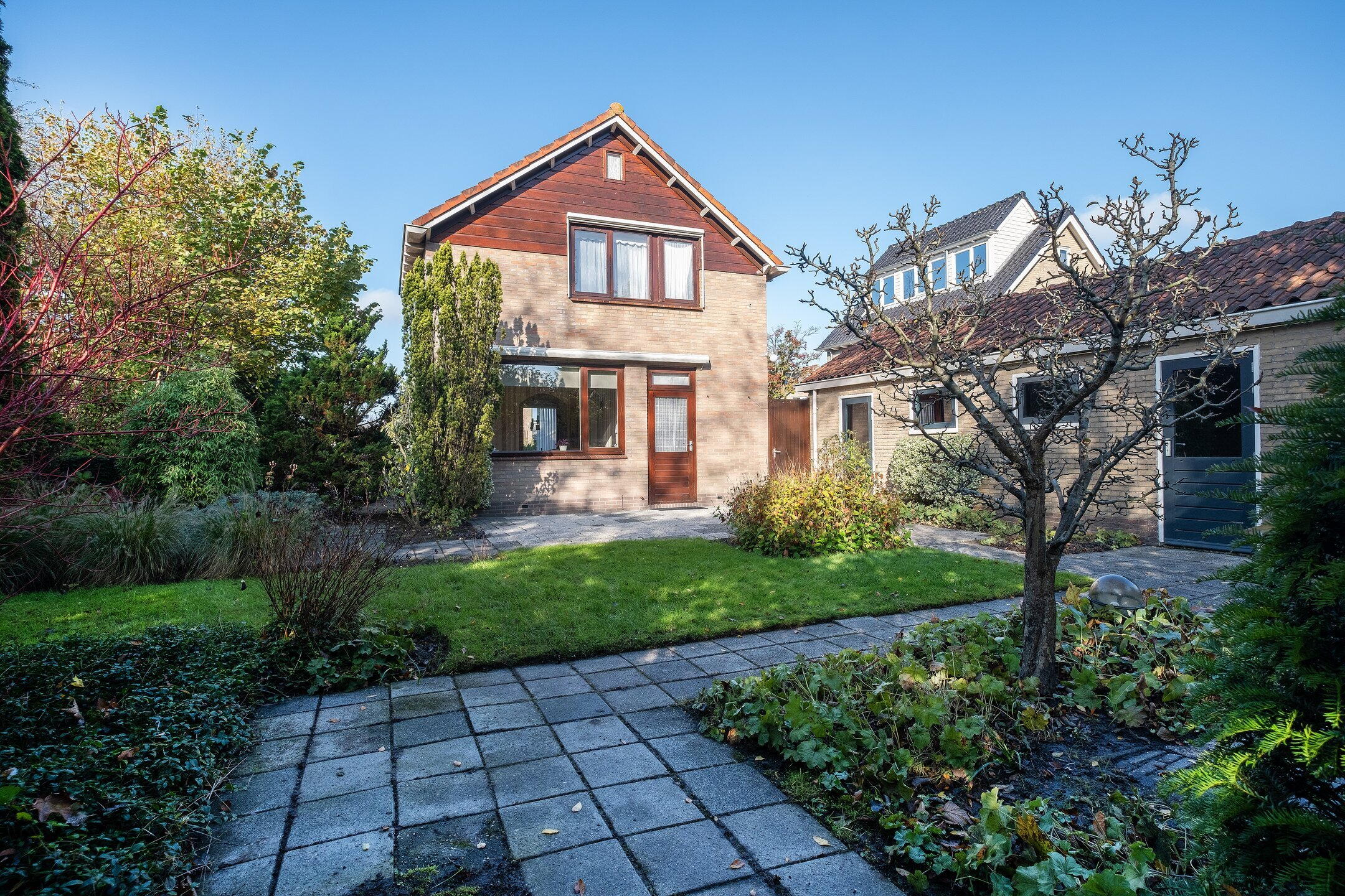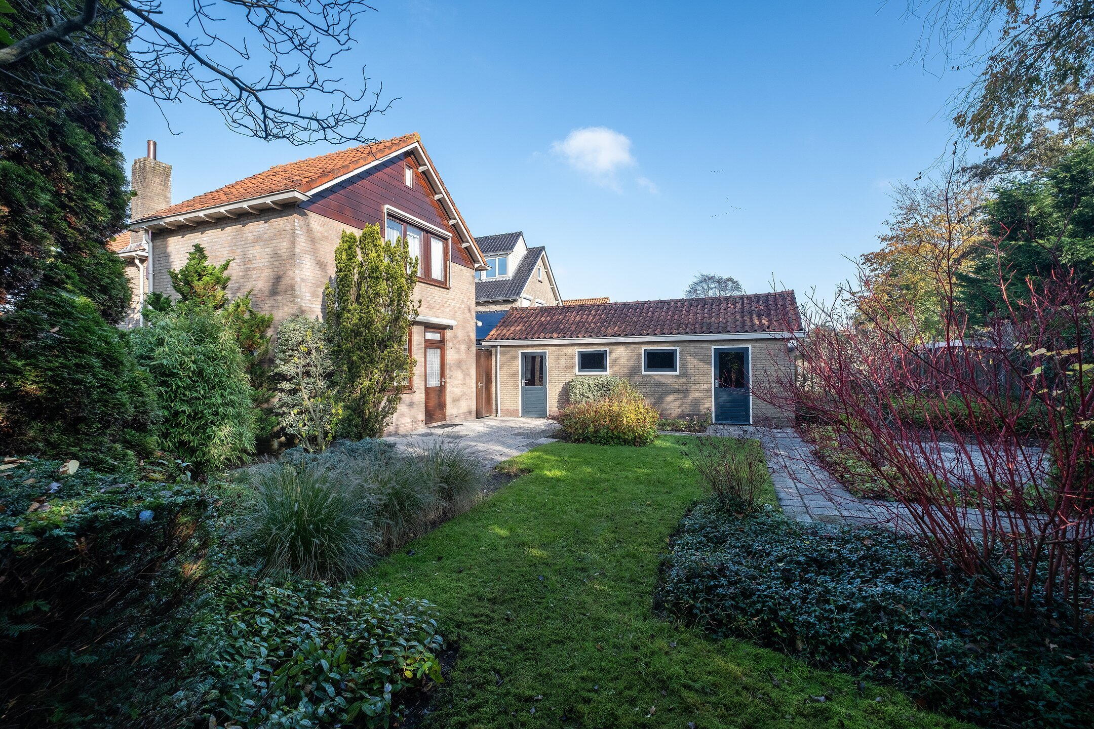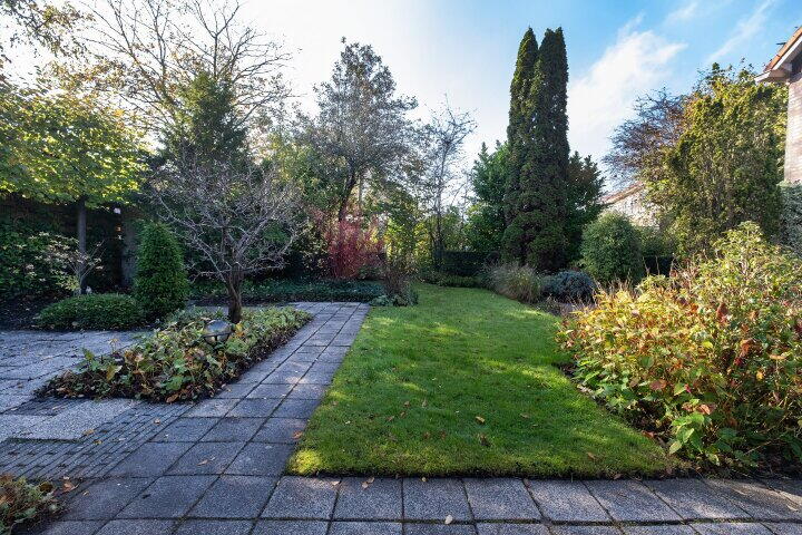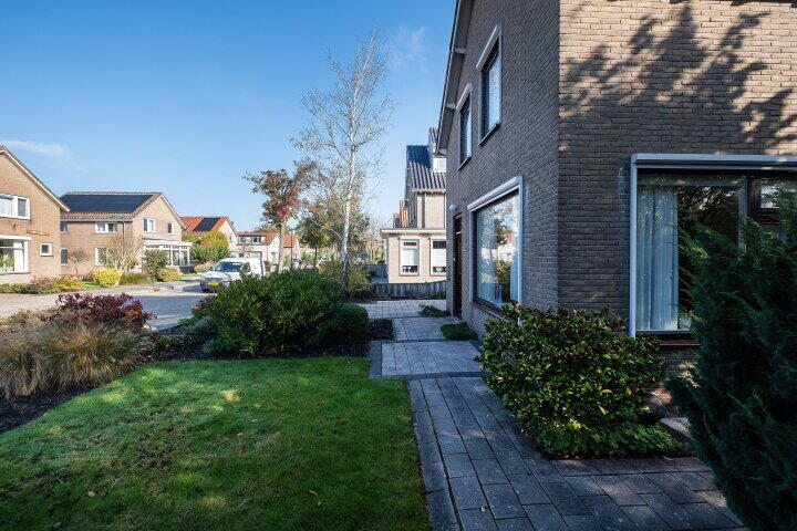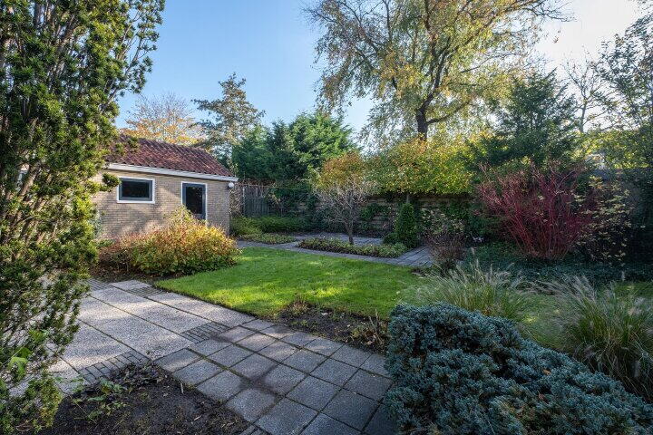 De ruime en zonnige tuin biedt volop mogelijkheden om te genieten van het buitenleven. Via de ruimte tussen de woning en de garage heb je een makkelijke toegang tot de tuin.