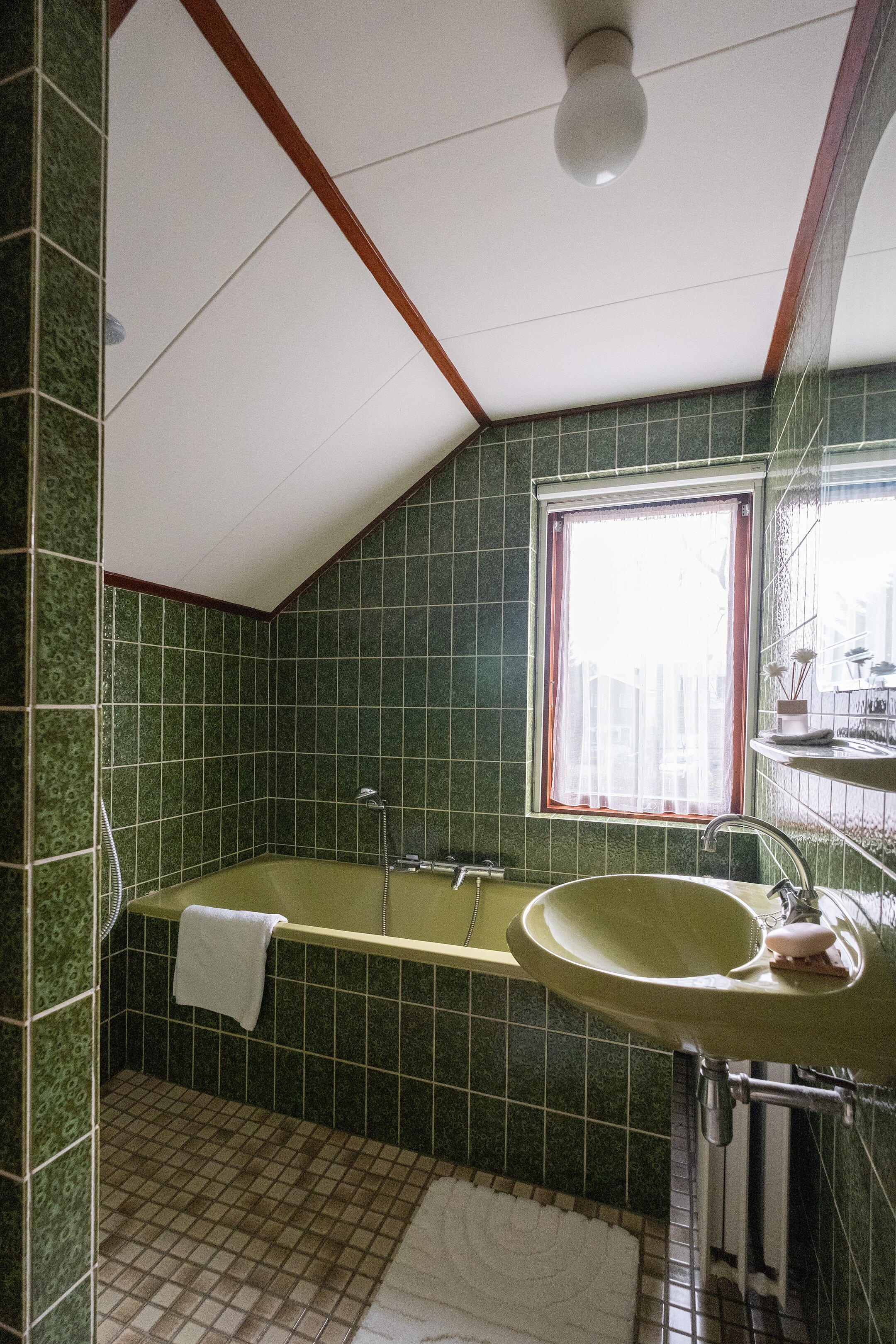 - Inloopdouche, ligbad, toilet, en wastafel