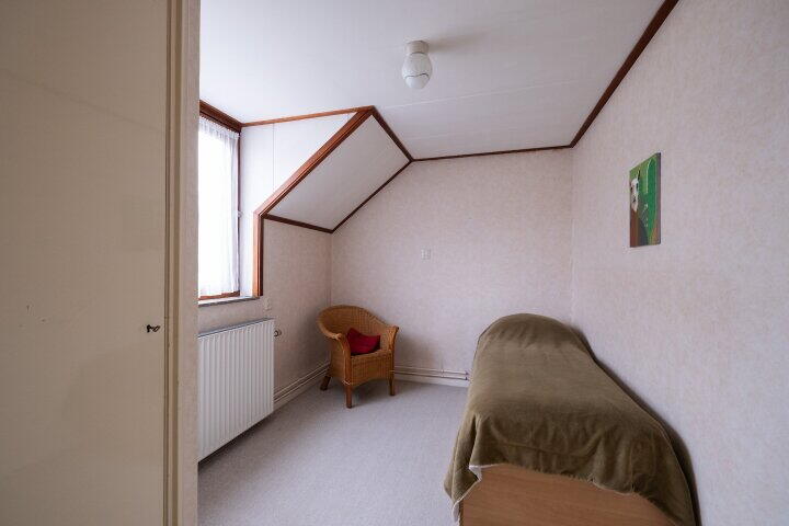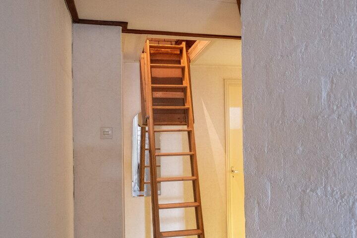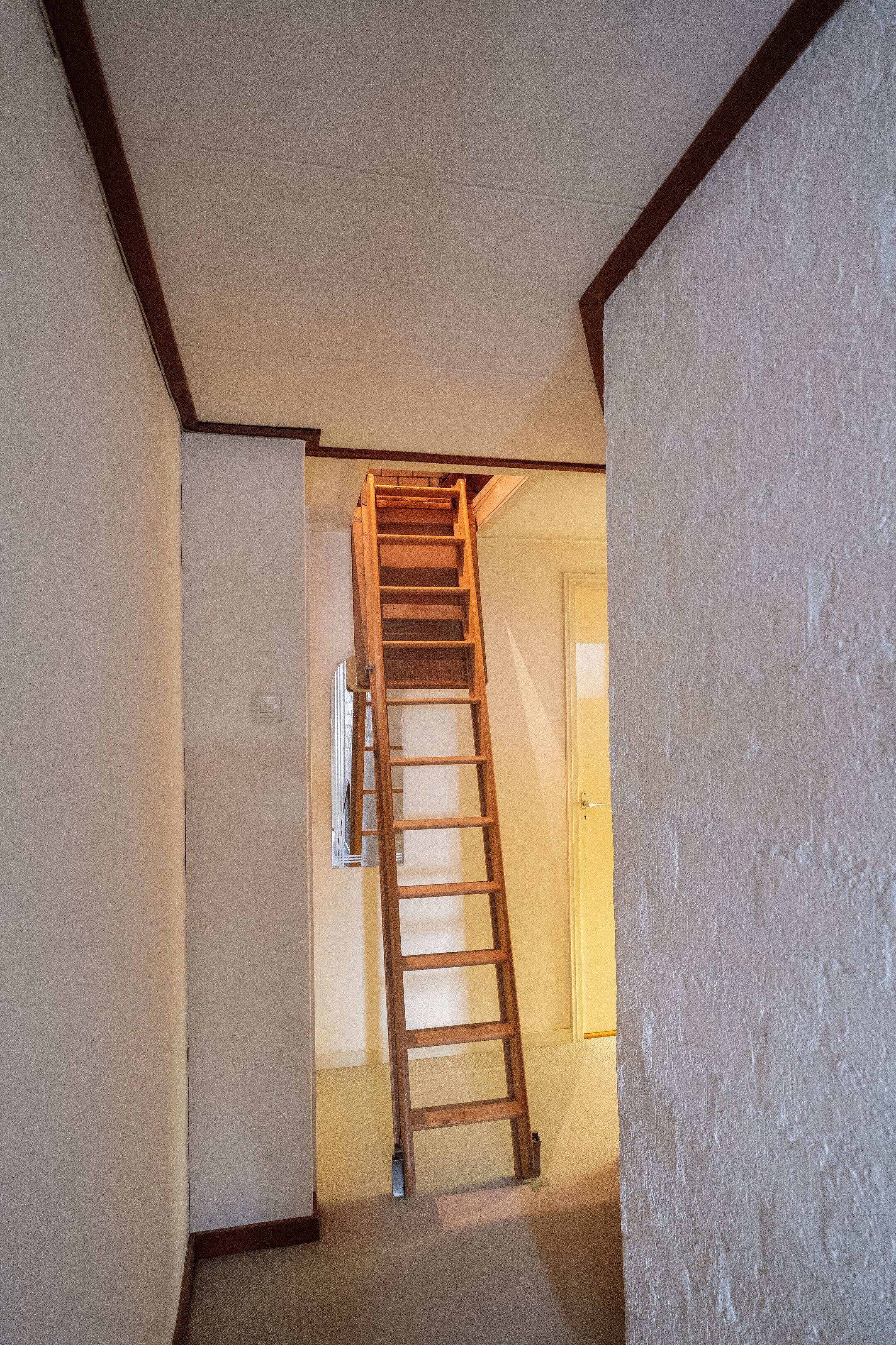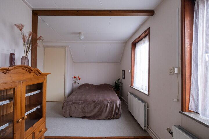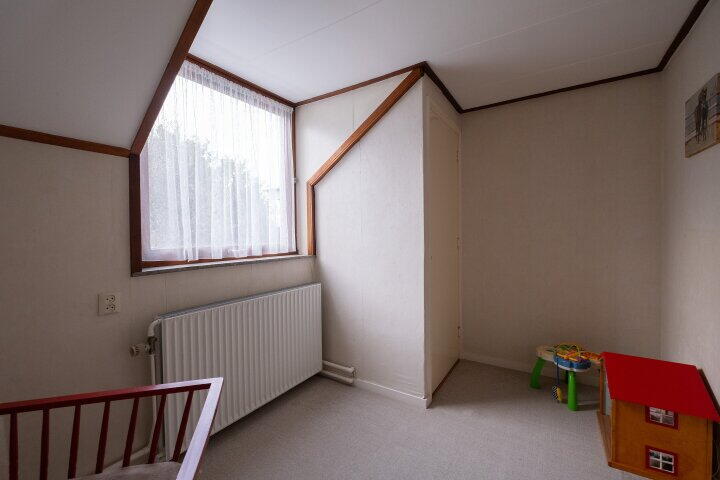 Op de eerste verdieping bevinden zich vier slaapkamers en een volledig betegelde badkamer met ligbad, douche, toilet en wastafel. Via een vlizotrap is de bergzolder bereikbaar, ideaal voor extra opslagruimte.