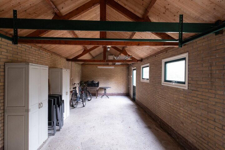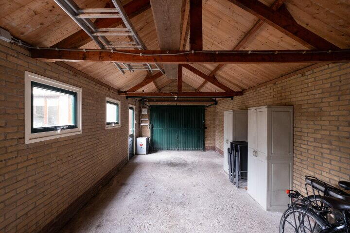 Achterin een ruime vrijstaande stenen garage die is voorzien van twee loopdeuren in de zijgevel, een kanteldeur aan de voorzijde, betonnen vloer, electra en is perfect voor opslag of als werkruimte. Op de oprit is ruimte voor meerdere auto’s.